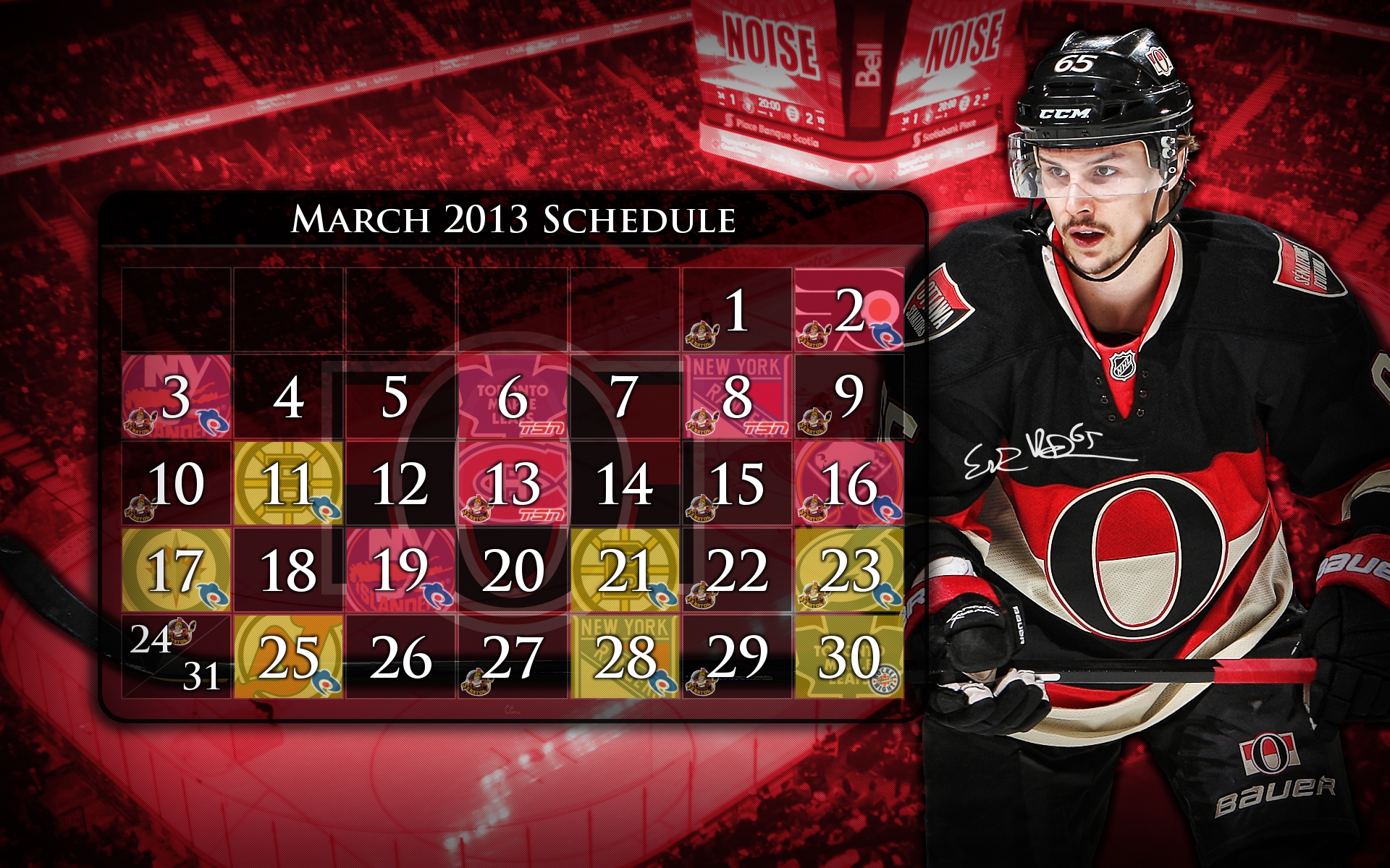 We’re already two games into Ottawa’s March schedule, so it’s about time I get around to posting the monthly schedule wallpaper. This month’s features reigning Norris champion (and current LTIR resident) Erik Karlsson. Home games appear in gold, away games in red. Bingo logos denote Binghamton Senators game days, and CBC/TSN/Sportsnet logos denote the broadcaster for that game. Click on the image for the full 1920×1200 version!